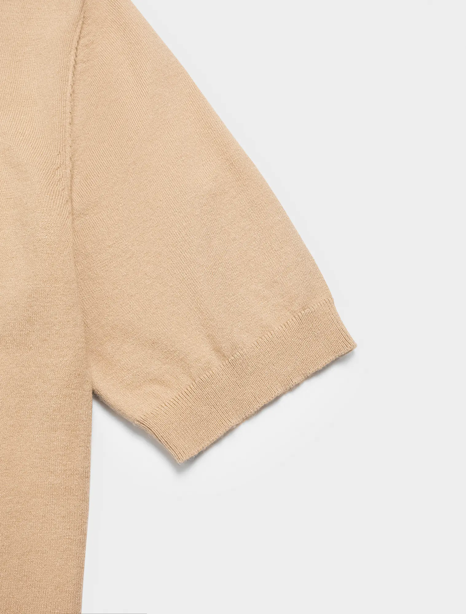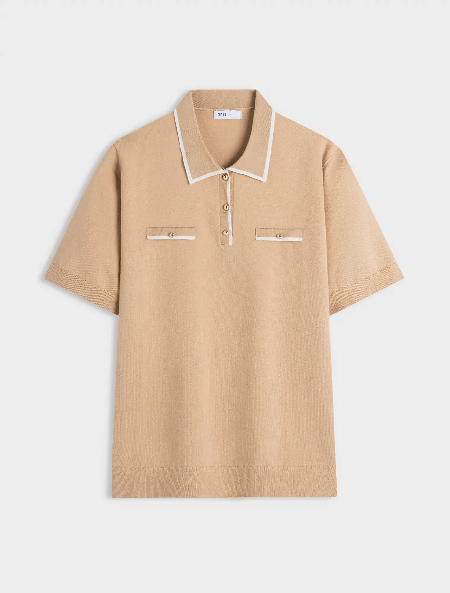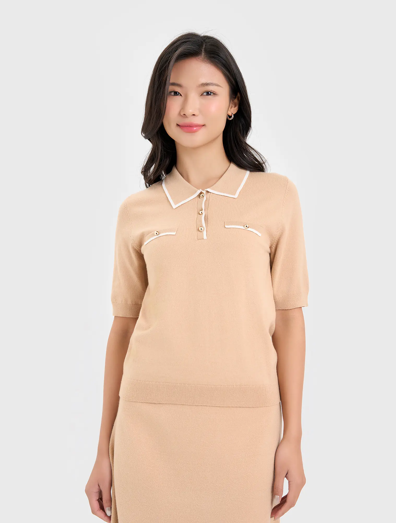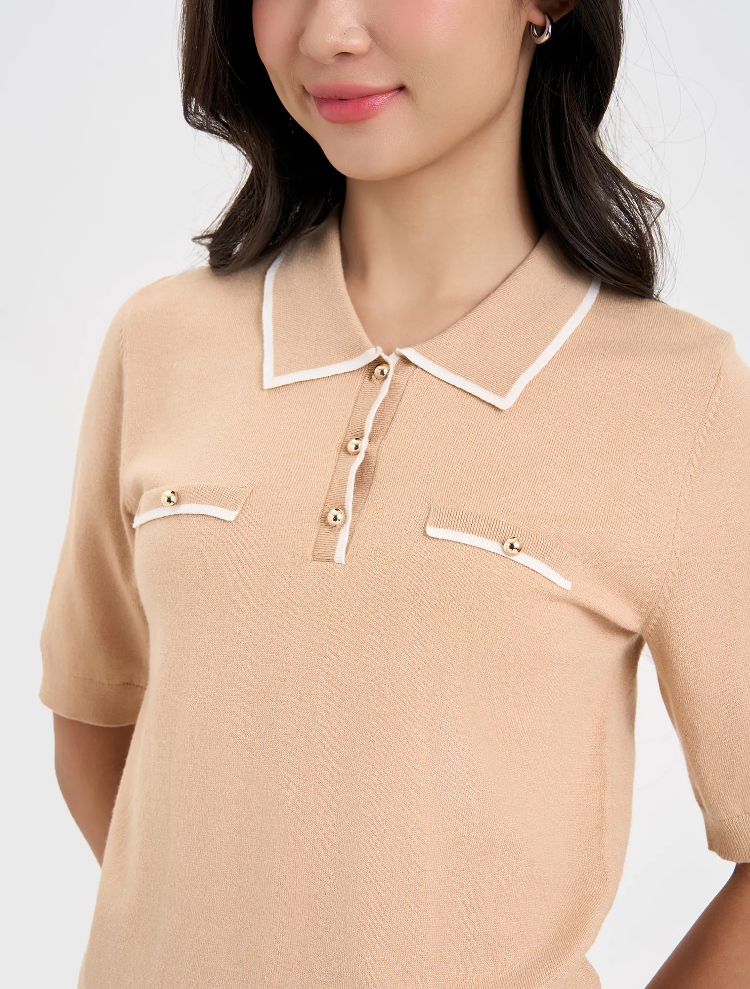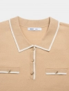 Áo len cổ polo phối màu, tay lỡ dáng ôm vừa, chất liệu mềm mại, thoải mái.