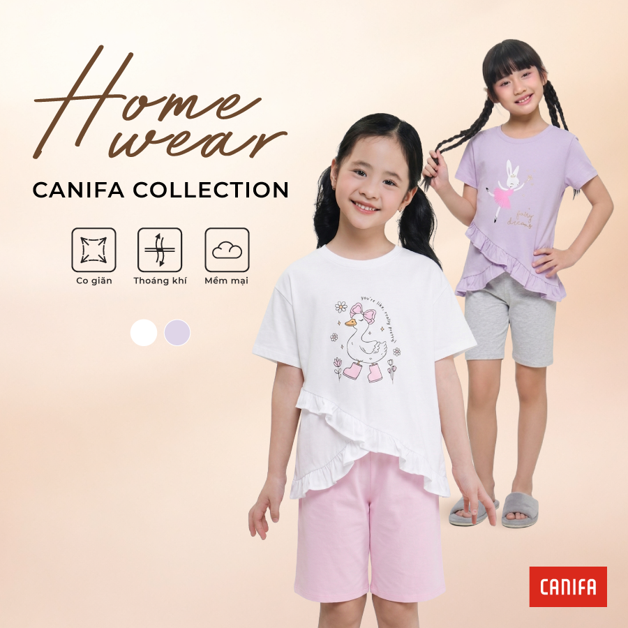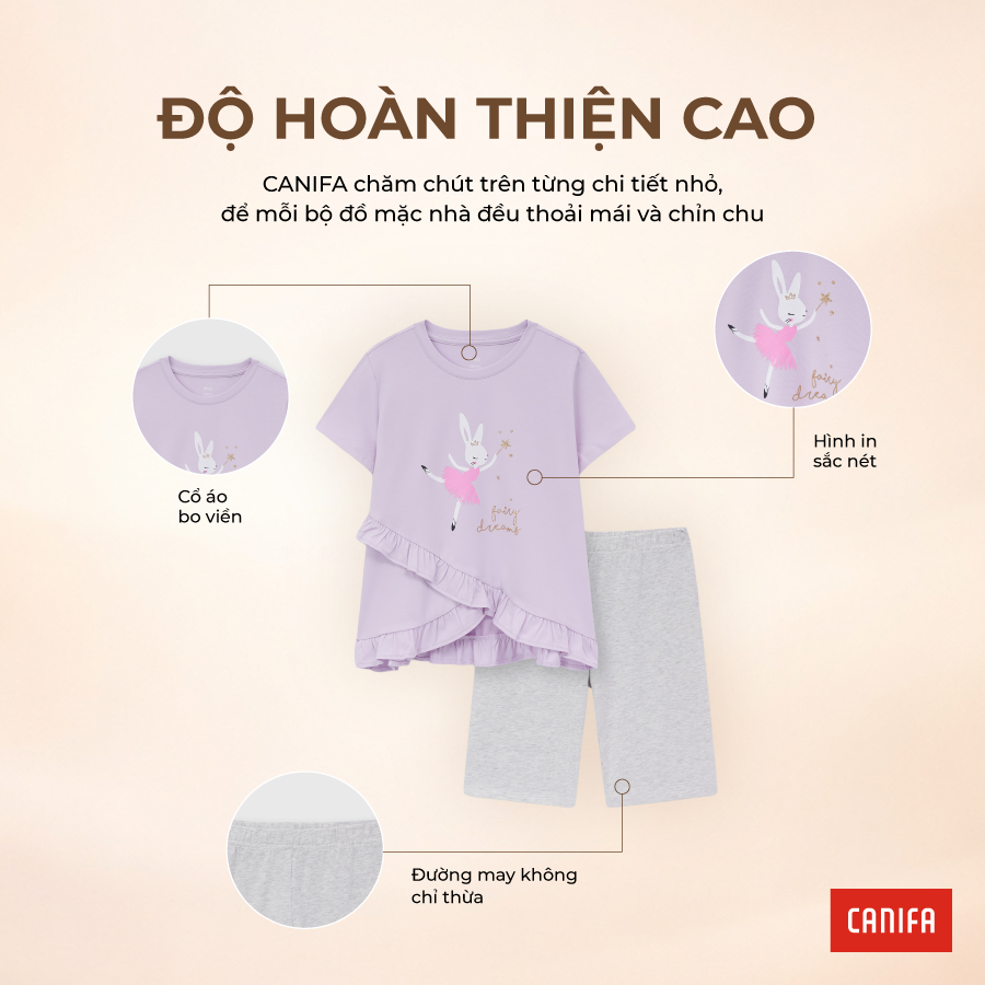 Bộ mặc nhà bé gái có hình in, thân áo nhún bèo nữ tính, phom áo thoải mái, quần legging ngắn, ôm vừa.